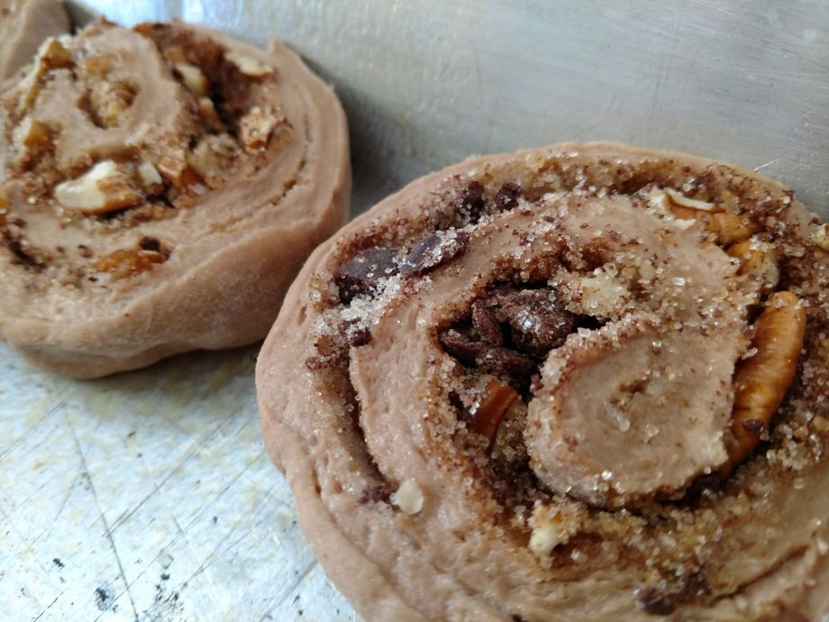 Smear 3/4 cup of softened butter over top. Next evenly sprinkle, distribute and rub brown sugar over top. Next sprinkle with desired amount of cinnamon. If you desire to add pecans, do so at this time. I like to COVER my dough in toppings so that you can’t see it, except for very small strip on each of the long sides. If that means using more butter and sugar, please feel free to do so.