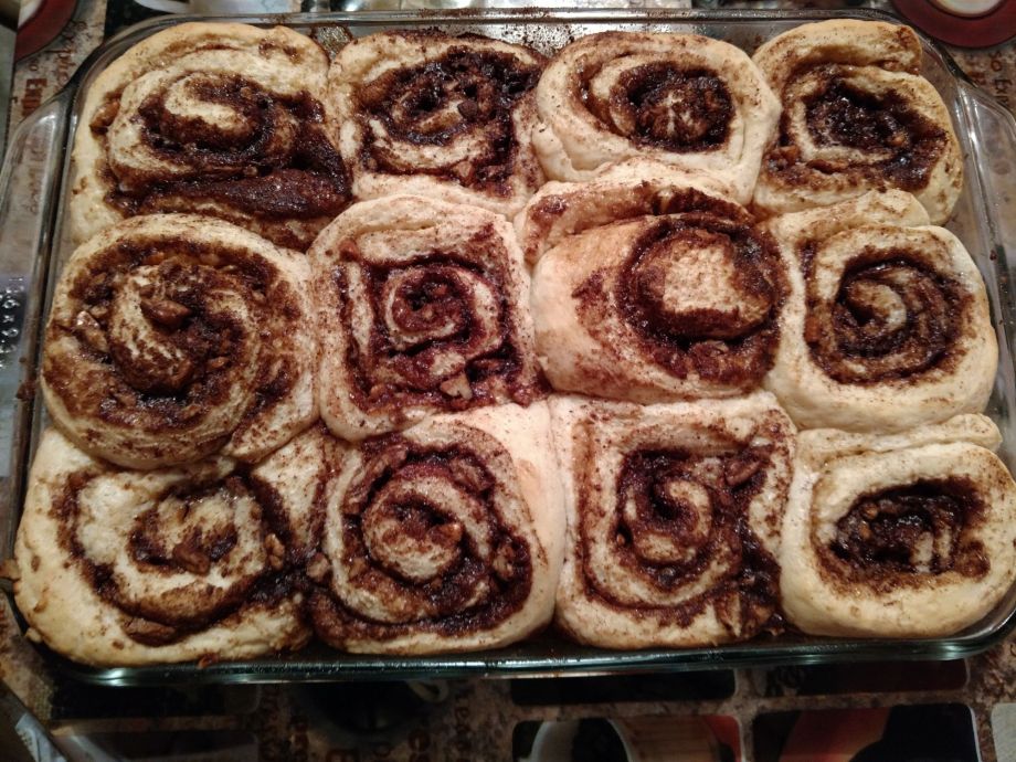 Cover with dish towels and let cinnamon rolls rise in the pan in a warm, dry place, about 30 minutes or an hour, until they have doubled in size.