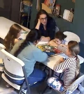 We moved on from our snack to make stress balls out of balloons and flour. It was a super simple and fun craft! The kids really enjoyed drawing funny faces on their balloon balls after they filled them with flour. Sarita had opted to do a shorter craft so that we could play a board game since there were only four of us (Sarita, Chloe, Aubri, and Evelynn, I translated the game into Spanish, and Tobias sat in his highchair and ate stale cheetos). Sarita chose to play “Sorry!” which ended up being a really fun time and she won!